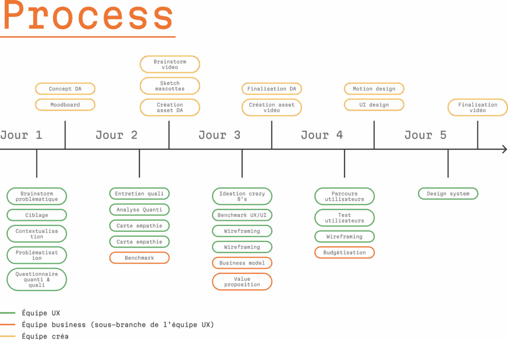 Dans le cadre d’une Startup Week organisée par l’ESD, nous disposions de cinq jours pour concevoir un projet de startup et le présenter lors d’un pitch devant des investisseurs.J’ai assuré la direction d’une équipe de 11 personnes, répartie en deux pôles complémentaires : création et UX. La stratégie et la cohérence globale du projet ont été co-pilotées à deux, tout en accompagnant activement l’équipe UX dans la structuration de l’expérience.
